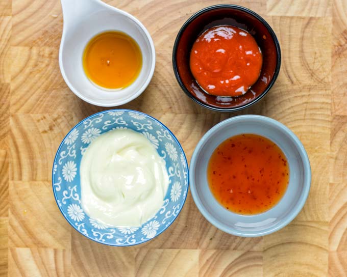 - Combine vegan mayo, sriracha, sweet chili sauce, maple syrup in a small bowl. Add optional garlic powder and smoked paprika. Season with a pinch of salt and pepper. Mix everything well until combined.