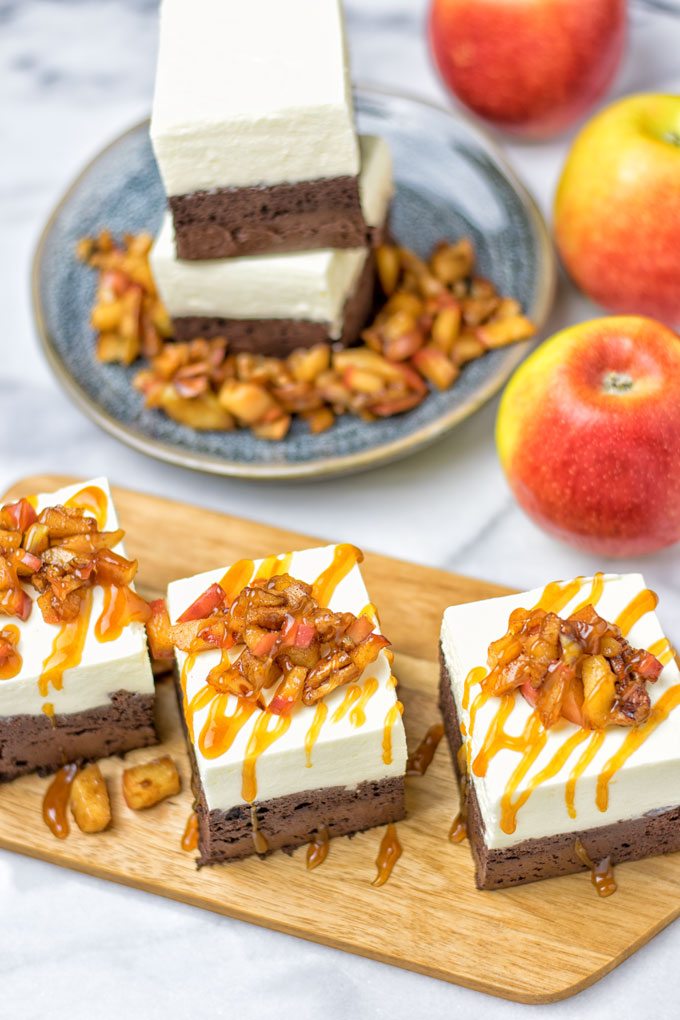 Tasty Cheesecake Brownies with Caramel Apples. Vegan, quick & easy to make, these gluten free brownies come out moist and sweet without added refined sugar. Absolutely delicious and perfect for a dessert full of fall flavors. Bring every Thanksgiving dinner to end on a high.