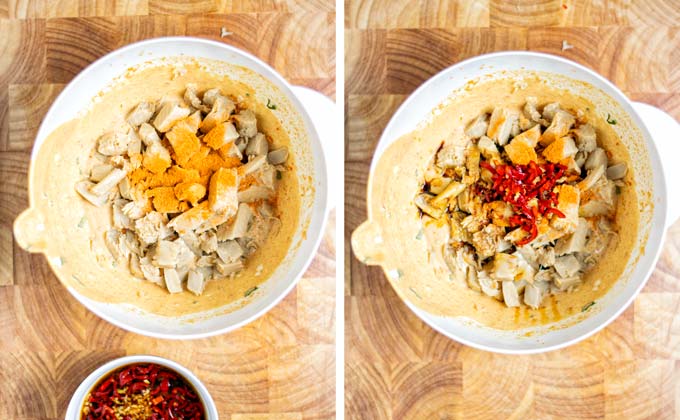 - Heat sesame oil in a skillet. Add the marinated vegan chicken and fry it for around 4 minutes. Set aside and let it cool down for at least 5 minutes.