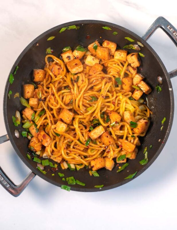 Tofu is a key ingredient here. Using firm or extra-firm tofu and pressing out excess water ensures it crisps nicely in the pan. A quick sear in vegetable oil creates golden edges that contrast beautifully with the tender noodles.
