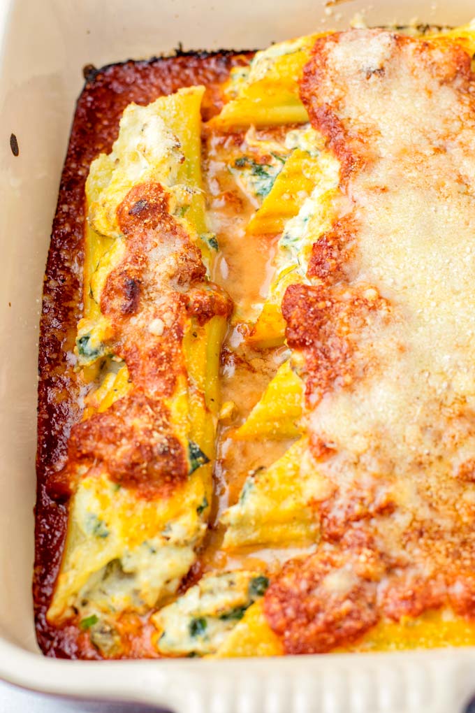 - Now use the Manicotti filling and give about 3 teaspoon into the noodles. Place them in the oven dish, repeat that until all shells are stuffed. Give the rest of the filling on top, cover everything with the remaining marinara and the reserved vegan Parmesan.