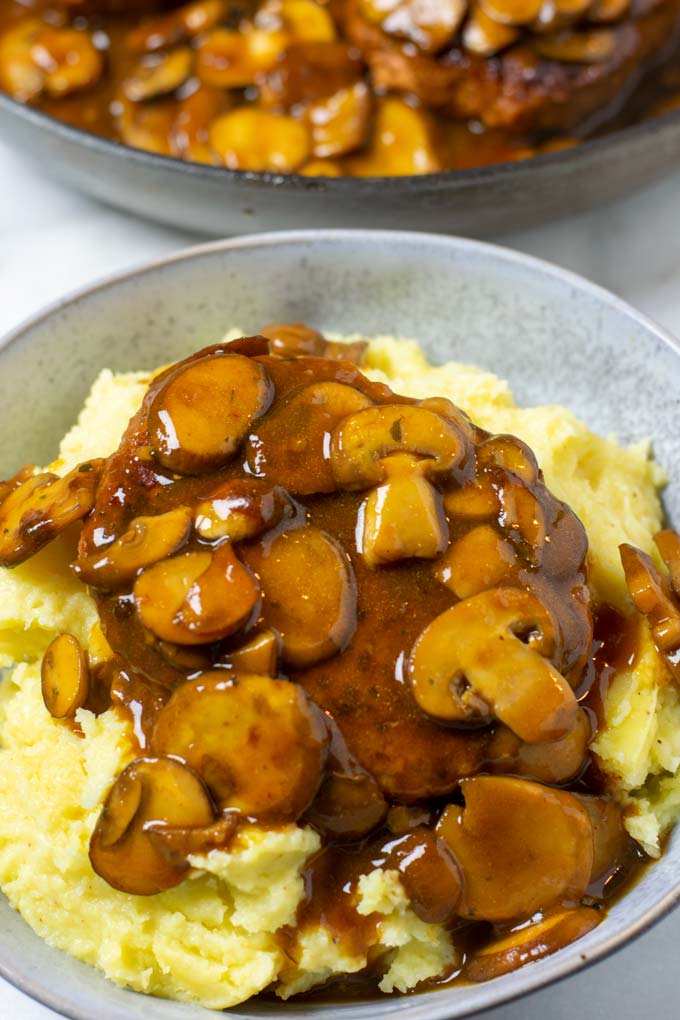 You can tell a Salisbury Steak is made with more robust ingredients like breadcrumbs, lots of seasonings, sauce and so versatile served with Garlic Mashed Potatoes or pasta.