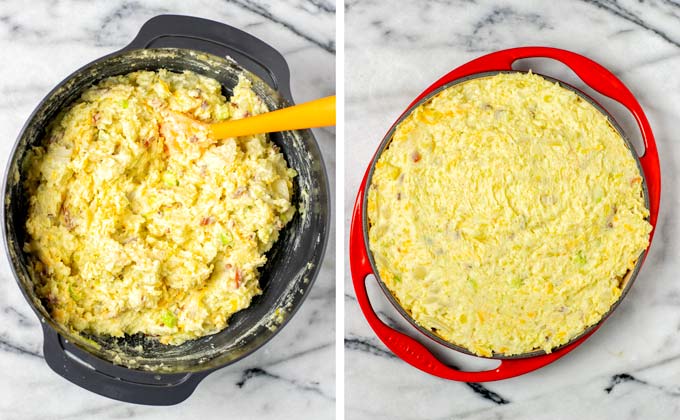 - Give the mashed potato mix into the 10 inch casserole. Top with the remaining vegan bacon, vegan cheddar, and scallions, on top bake then bake for around 20 minutes.